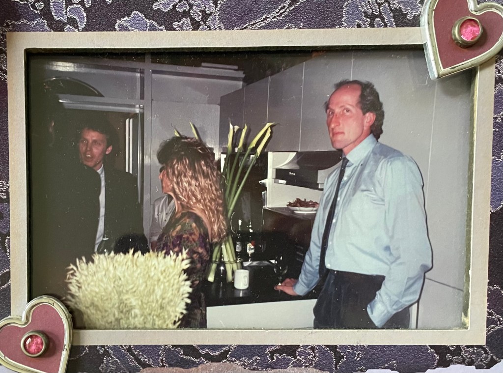 Someone gave us a photo of Debbie and I from that night and it sits in a place of honor on our mantle. That’s me on the left, mid-sentence, talking to my acting teacher. Debbie is in profile holding the wine I poured her. No one knows who the skinny-tie-guy is, but he’s holding an empty wine glass so that might explain his expression of exasperation.