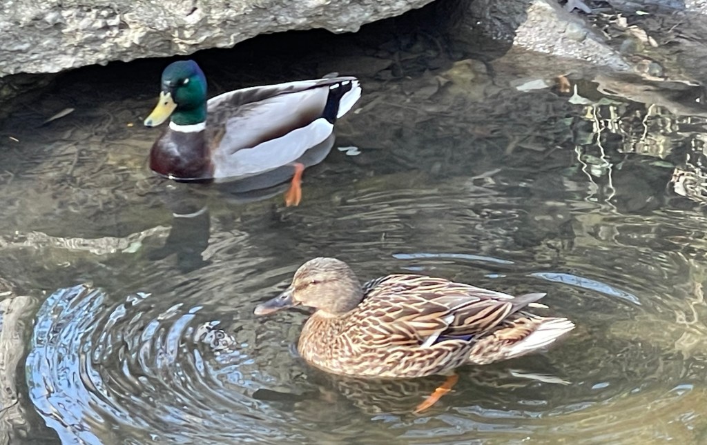 This pair of Mallard ducks arrive every year about this time and enjoy paddling around in the stream. I’ve never seen them with youngsters, but this is their mating season. Fun fact: the Mallards are a sub-family of ducks called dabbling ducks. Isn’t that cute?