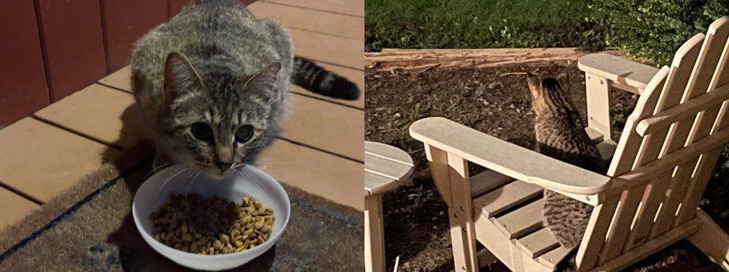 That’s Tabitha on the left eating from the bowl. She’s brought us eleven kittens over three years. We’ve found them homes or had them taken to the Humane Society where they were adopted. She’s walking with a distinctive waddle now. We think she’ll give birth any day.