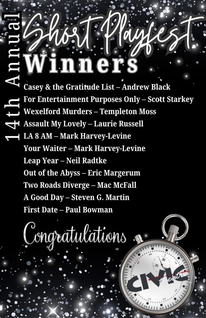 I’m pleased to announce that my 10-Minute play “Out of the Abyss” was chosen for this year’s Civic Theatre Play Festival in June. There are so many talented playwrights on this list and I am both honored and humbled to be among them.