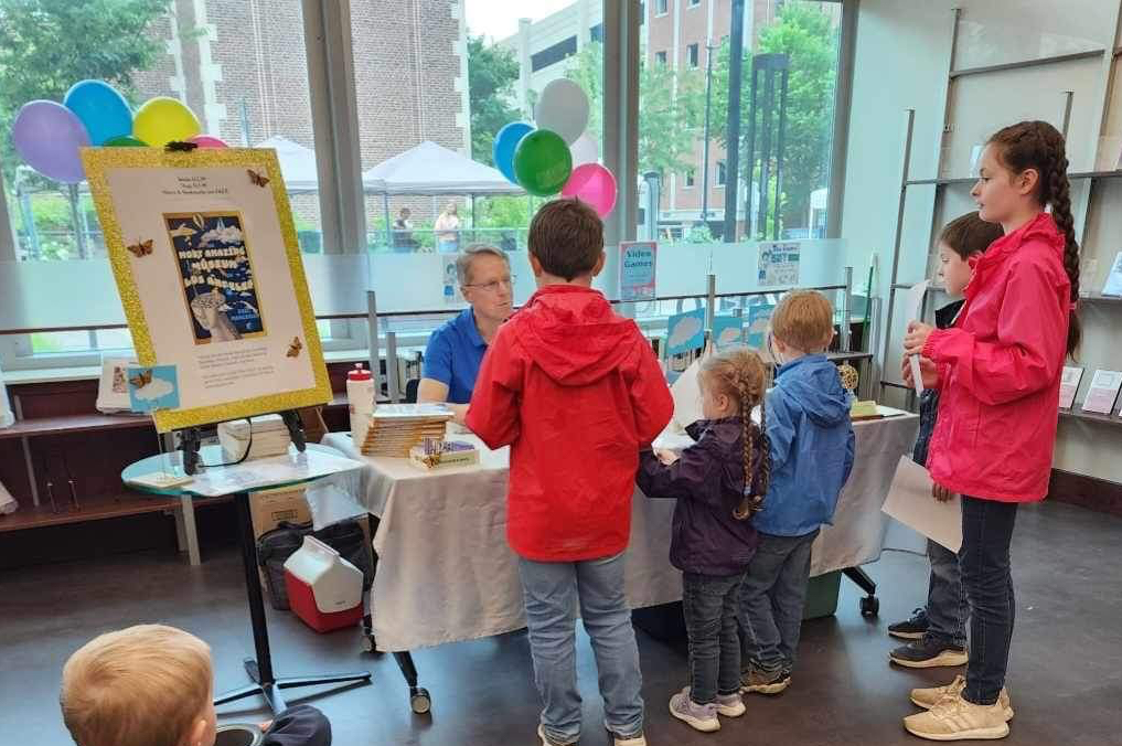 I was honored to receive an email recently telling me that my book would be featured in a display at The Caretaker’s Cottage curated by the West Lafayette Public Library. My wife and I went over to see it and she took this photo of me. You can see MAMLA on the top shelf of the display case farthest to the right.